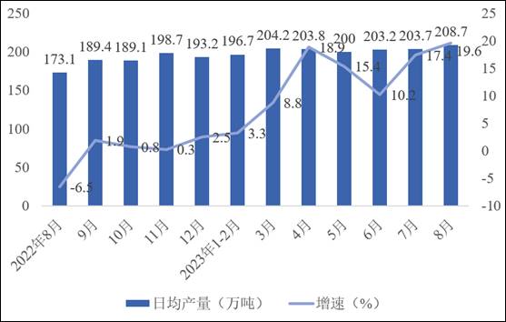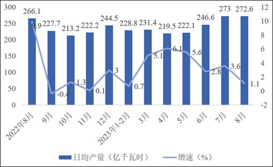 我国正在朝着减少对传统煤炭和火力发电的依赖,增加清洁和可再生能源的使用方向发展。2023年8月份,发电量8450亿千瓦时,同比增长1.1%;原油加工量6469万吨,同比增长19.6%。2023年8月份,在主要能源电力产品中,基本呈现增长趋势,仅火力发电和风力发电有所下降。石油和天然气产量的增长也表明我国继续保持对传统能源的需求。