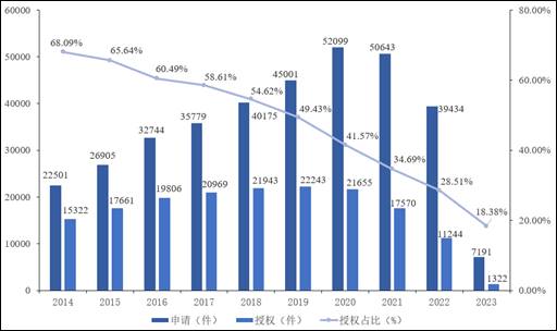 展示该技术领域逐年公开的专利申请量、授权量及对应授权率(当年申请的专利授权量/当年申请量)。申请量较多的年份为该技术领域热度较高的年份,申请趋势上升可以反映该技术领域研发投入呈上升趋势。由于发明授权的周期长,专利公开具有延后性,因此近2-3年的申请量和授权率可能偏低。