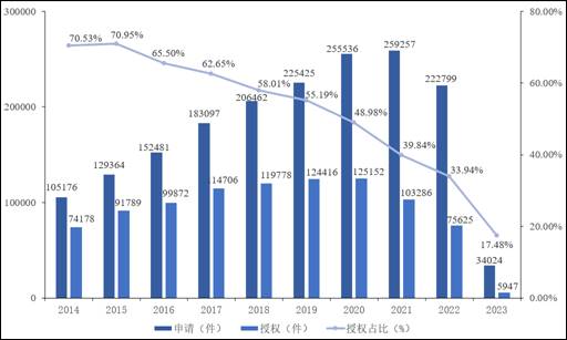 展示该技术领域逐年公开的专利申请量、授权量及对应授权率(当年申请的专利授权量/当年申请量)。申请量较多的年份为该技术领域热度较高的年份,申请趋势上升可以反映该技术领域研发投入呈上升趋势。由于发明授权的周期长,专利公开具有延后性,因此近2-3年的申请量和授权率可能偏低。