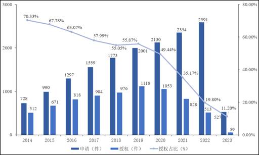 展示该技术领域逐年公开的专利申请量、授权量及对应授权率(当年申请的专利授权量/当年申请量)。申请量较多的年份为该技术领域热度较高的年份,申请趋势上升可以反映该技术领域研发投入呈上升趋势。由于发明授权的周期长,专利公开具有延后性,因此近2-3年的申请量和授权率可能偏低。