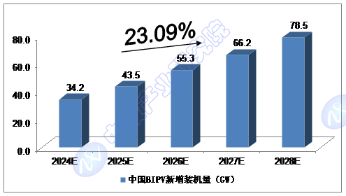 我们预计,2024年我国BIPV新增装机量将达到34.2GW,未来五年(2024-2028)年均复合增长率约为23.09%,2028年将达到78.5GW。