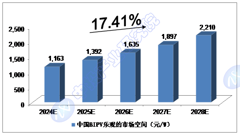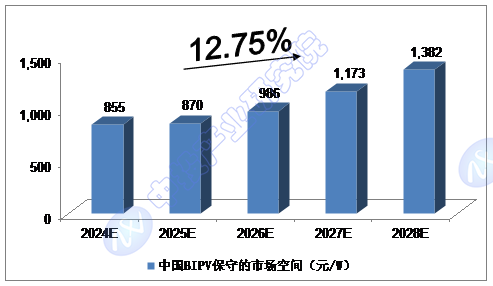 我们预计,2024年我国BIPV保守的市场空间将达到855元/W,未来五年(2024-2028)年均复合增长率约为12.75%,2028年将达到1,382元/W。
