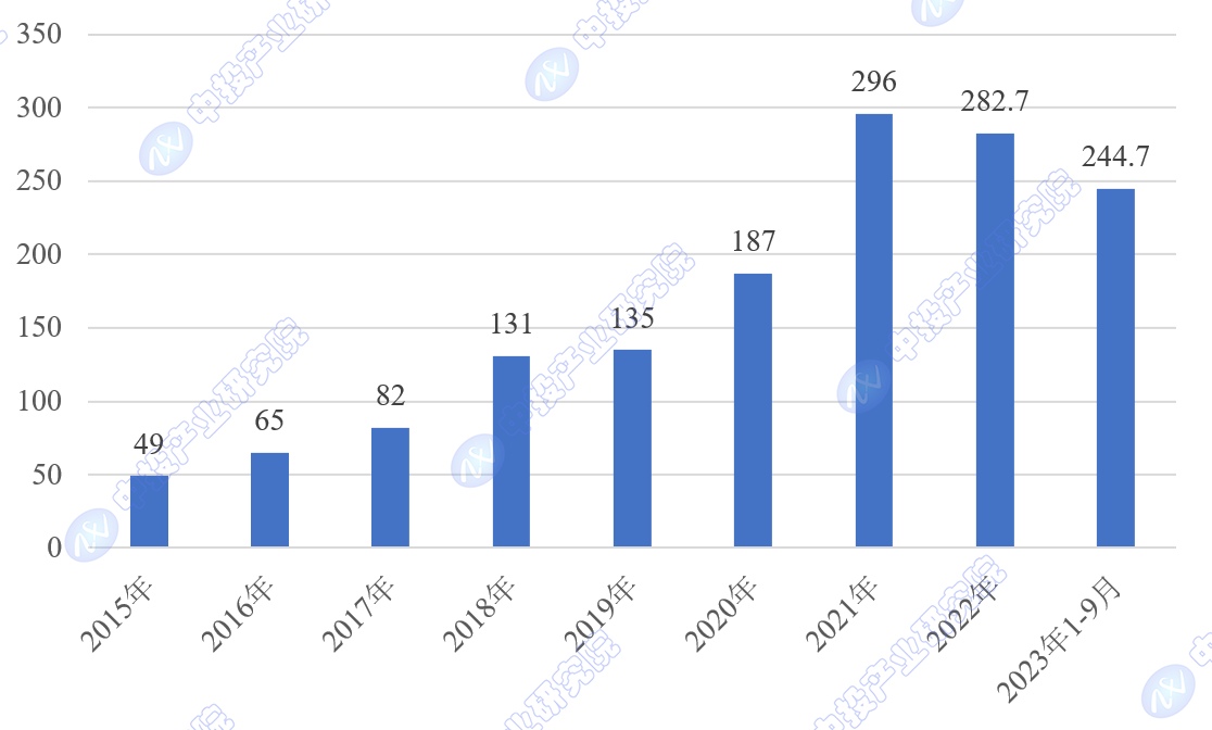 根据中投产业研究院发布的《2023-2027年中国半导体设备行业深度调研及投资前景预测报告》显示,近年来,我国半导体设备行业在下游快速发展的推动下,保持快速增长。2022年中国半导体设备市场规模为282.7亿美元,2017-2022年复合增长率为28%,增速明显高于全球。2023年前三季度,中国大陆半导体设备销售额为244.7亿美元。