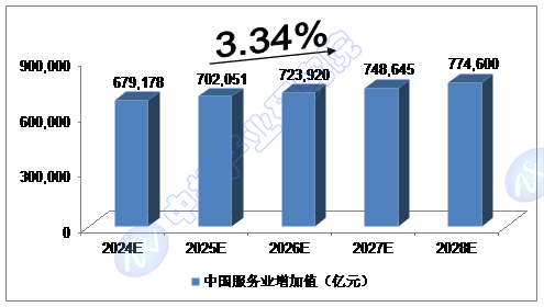 我们预计,2024年我国服务业增加值将达到679,178亿元,未来五年(2024-2028)年均复合增长率约为3.34%,2028年将达到774,600亿元。