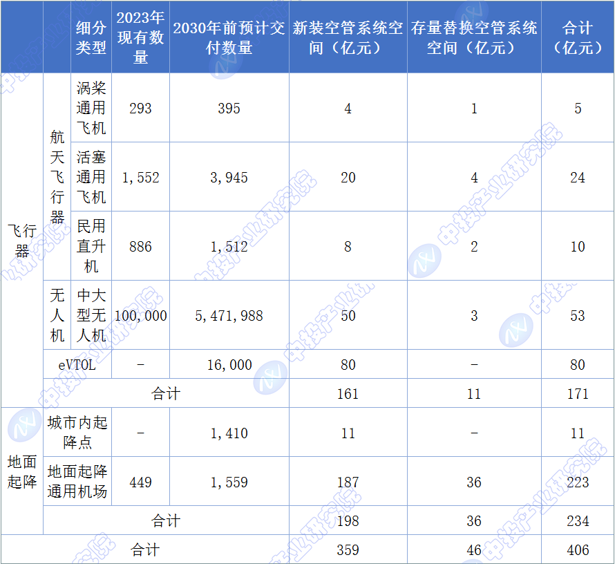 中投产业研究院发布的《2024-2028年中国低空经济深度调研及投资前景预测报告》综合考虑机载和地面设施并分别进行市场测算。考虑到eVTOL的商业化运营节奏以及相关政府规划试点,中投产业研究院将2030年作为时间节点进行测算,预计到2030年低空相关空管系统市场规模406亿元。