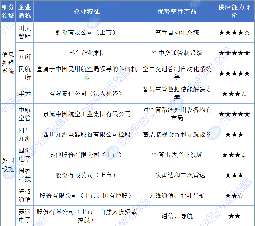 目前,我国空管系统行业主要供给的企业包括信息管理系统和空管外围设备两类,其中以二十八所、民航二所为代表的央国企和以川大智胜为代表的上市公司行业的供应能力较高。