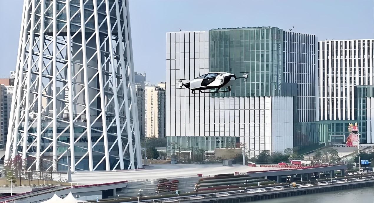 图为2024年3月8日,小鹏汇天、合利智能等多家企业协调,小鹏汇天飞行汽车旅航者X2顺利完成城市CBD“天德广场-广州塔”区域的低空飞行。