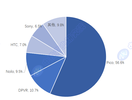 2023年,中国VR市场仍以Pico为主,市场份额达56.6%,超过一半。其次分别为DPVR、Nolo、HTC、Sony,占比分别为10.7%、9.4%、7.0%、6.5%。