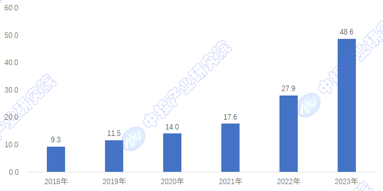电池、建筑保温领域有广阔的应用前景。目前市场上常见的气凝胶主要是硅气凝胶、碳气凝胶和二氧化硅气凝胶。中投产业研究院发布的《2024-2028年中国气凝胶行业深度调研及投资前景预测报告》显示:近年来,中国气凝胶市场规模一直保持增长趋势,2022年我国气凝胶市场规模大约为27.9亿元,2023年我国气凝胶市场规模大约为48.6亿元。