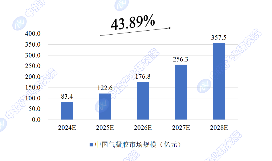 中投产业研究院预计,2024年我国气凝胶市场规模将达到83.6亿元,未来五年(2024-2028)年均复合增长率约为43.89%,2028年将达到357.5亿元。