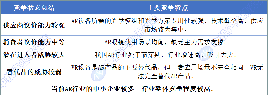 中投产业研究院发布的《2024-2028年中国扩展现实(XR)行业深度调研及投资前景预测报告》指出,中国增强现实(AR)产业链涉及多个行业和企业,硬件供应商有Realmax、亮风台等;软件供应商主要有Unreal、百度等;内容制作与分发企业包括字节跳动、阿里巴巴、腾讯等;应用端则包括腾讯视频等。用五力竞争模型对中国增强现实(AR)行业竞争情况分析如下: