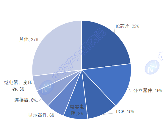 中投产业研究院发布的《2024-2028年中国未来产业之智能控制器行业趋势预测及半岛综合体育安卓版 研究报告》指出:智能控制器产业链上游主要由IC芯片、分立器件、PCB、电阻电容、显示器件、连接器等电子元器件构成。从原材料成本占比来看,IC芯片成本占比最高,达23%。
