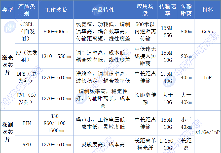 光芯片是采用半导体芯片制造工艺,以电激励源方式,以半导体材料为增益介质,将注入电流的电能激发,从而实现谐振放大选模输出激光,实现电光转换。光芯片按功能分类:分为激光器芯片和探测器芯片,其中激光器芯片主要用于发射信号,将电信号转化为光信号,探测器芯片主要用于接收信号,将光信号转化为电信号。