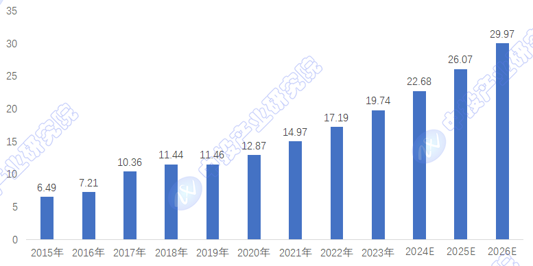 近年来,全球流量快速增长、各场景对带宽的需求不断提升,行业主要三大市场:电信市场、数据中心市场和消费电子市场共同推动了光芯片市场空间的不断拓展。中投产业研究院发布的《2024-2028年中国光芯片行业深度调研及投资前景预测报告》指出:2022年我国光芯片市场规模约为17.19亿美元,2015-2022年的CAGR达到14.93%。根据测算,2023年我国光芯片市场规模约19.74亿美元,预计2026年有望扩大至29.97亿美元。