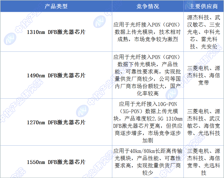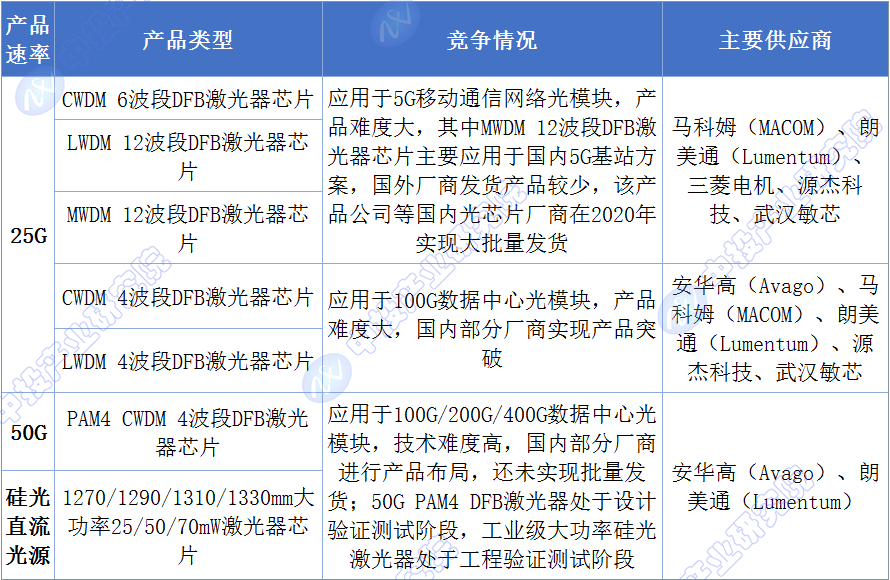 中投产业研究院发布的《2024-2028年中国光芯片行业深度调研及投资前景预测报告》指出:国内专业光芯片厂商包括源杰科技、武汉敏芯、中科光芯、雷光科技、光安伦、云岭光电等。目前国内光芯片企业正在积极开发25G光芯片产品,源杰科技、光迅科技、仕佳光子、海信宽带等企业都有相关业务布局。