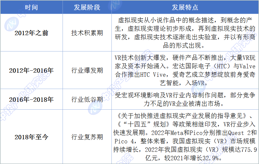 相较于全球,中国虚拟现实(VR)的发展起步较晚。中国虚拟现实(VR)的发展历程大致可分为四个阶段,分别是技术积累期、爆发期、低谷期和复苏期。