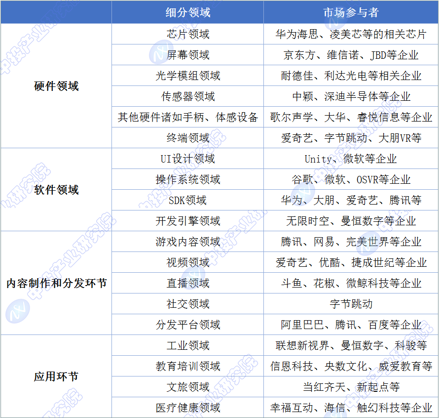 中投产业研究院发布的《2024-2028年中国扩展现实(XR)行业深度调研及投资前景预测报告》指出:中国虚拟现实(VR)产业链中主要包含硬件、软件、内容制作与分发,以及下游应用与服务四大板块。其中硬件包含核心器件、终端和配套外设,软件包含支撑软件和软件开发工具包,内容制作与分发包括内容制作和分发两大部分,下游应用与服务主要包括教育、医疗、服务等领域。中国虚拟现实行业市场参与者主要如下:
