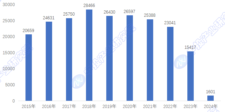 图表:2015-2024年国内有机硅技术相关专利申请规模变化