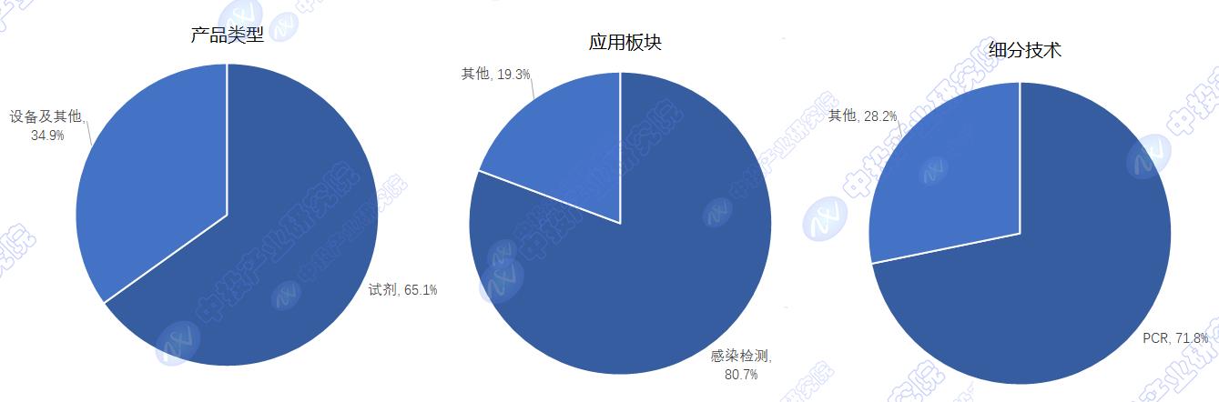 目前全球分子诊断市场规模不断增大,2022年全球分子诊断市场规模增至308.9亿美元。从产品类型来看,试剂部分在分子诊断市场中的收入份额最大,2022年的收入份额为65.1%;从应用板块来看,感染检测板块占据最大收入份额,2022年比重达80.7%;从技术细分市场来看,2022年,聚合酶链反应(PCR)细分市场的收入占比最大,为71.8%。