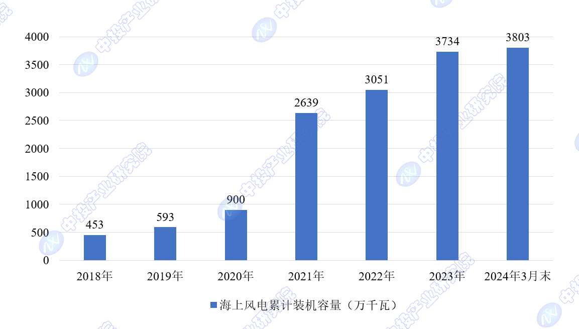 中投产业研究院发布的《2024-2028年中国海上风电行业深度调研及投资前景预测报告》指出,截至2023年底,我国海上风电累计装机3734万千瓦,在全球占比约50%,连续四年全球排名第一。2024年一季度,全国海上风电新增并网容量69万千瓦。截至2024年3月底,全国海上风电累计并网容量3803万千瓦。