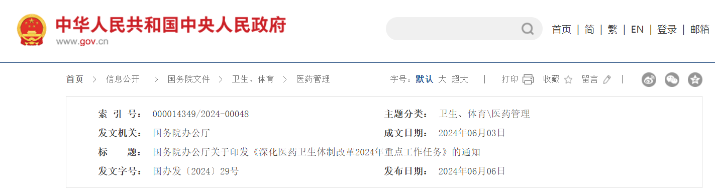2024年是中华人民共和国成立75周年,是实现“十四五”规划目标任务的关键一年。在这一大背景下,2024年6月6日,经国务院同意,国务院办公厅印发了《深化医药卫生体制改革2024年重点工作任务》(以下简称《任务》),旨在推动卫生健康事业的高质量发展,提升人民群众的获得感、幸福感和安全感。