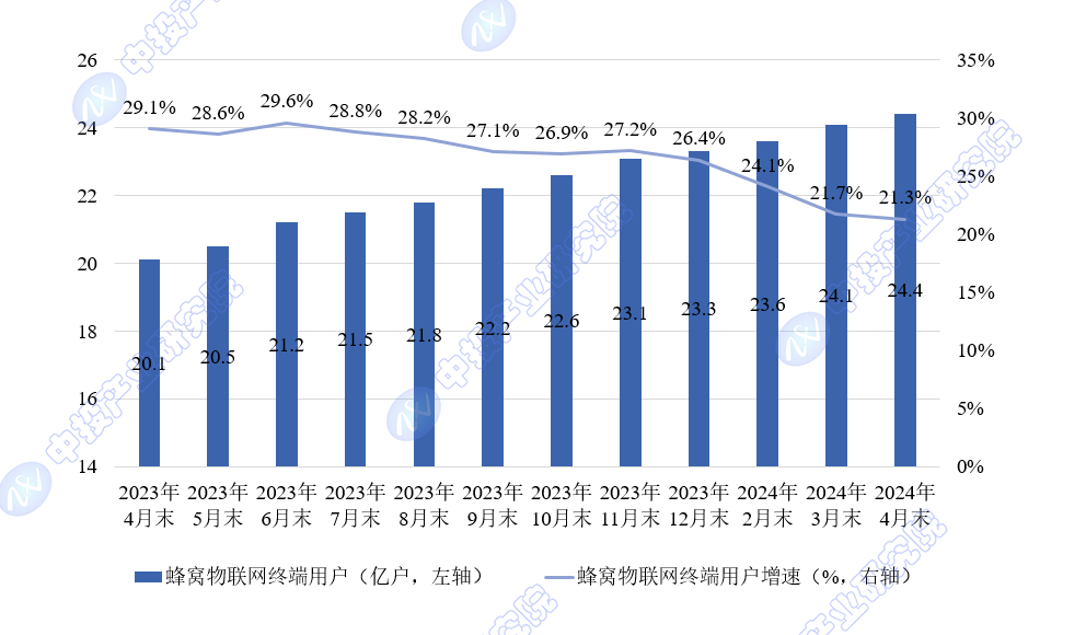 国内发展方面,从生产制造、公共服务到个人消费,国内移动物联网正加速融入生产生活,成为助推千行百业数字化转型升级的重要支撑。近年来,移动物联网的融合应用走深走实,5G应用已覆盖52个国民经济大类,移动物联网在数字城市建设、智慧交通、移动支付等领域实现较大规模应用。企业布局方面,截至2024年4月末,三家基础电信企业发展蜂窝物联网终端用户24.4亿户,比上年末净增1.08亿户,占移动网终端连接数(包括移动电话用户和蜂窝物联网终端用户)的比重达58.1%。IPTV(网络电视)总用户数达4.03亿户,比上年末净增229.3万户。