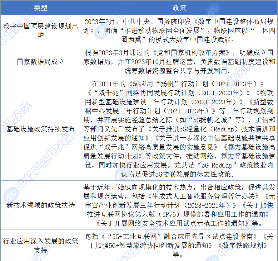 政策是推动物联网等新兴产业发展的重要力量,2023年,一批新的利好政策出台,推动物联网等新兴领域的发展。2023年2月,中共中央、国务院印发《数字中国建设整体布局规划》,明确“推进移动物联网全面发展”。物联网应以“一体四圈两翼”的模式为数字中国建设赋能。根据2023年3月通过的《党和国家机构改革方案》,明确成立国家数据局,并在2023年10月挂牌运营,负责数据基础制度建设和统筹数据资源整合共享与开发利用。基于近年开始迈向规模化的技术热点,出台相应政策,促进其发展和规范运营,包括《生成式人工智能服务管理暂行办法》《元宇宙产业创新发展三年行动计划(2023-2025年)》《关于加快推进互联网协议第六版(IPv6)规模部署和应用工作的通知》《关于开展网络安全技术应用试点示范工作的通知》等。