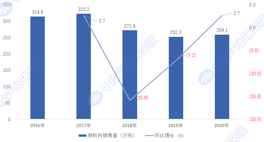 2016至2022年,我国原料药销售量呈先降后涨趋势。受产能变化影响,2017至2019年,我国原料药销售量连续下降,由323.2万吨下降至252.3万吨。2020年起,受宏观经济因素影响,国外原料药生产企业部分停产,国内原料药出口需求增长,我国原料药销售量亦逐年回升。2020-2022年,我国原料药销售量分别为259.1万吨、267.7万吨和296万吨。