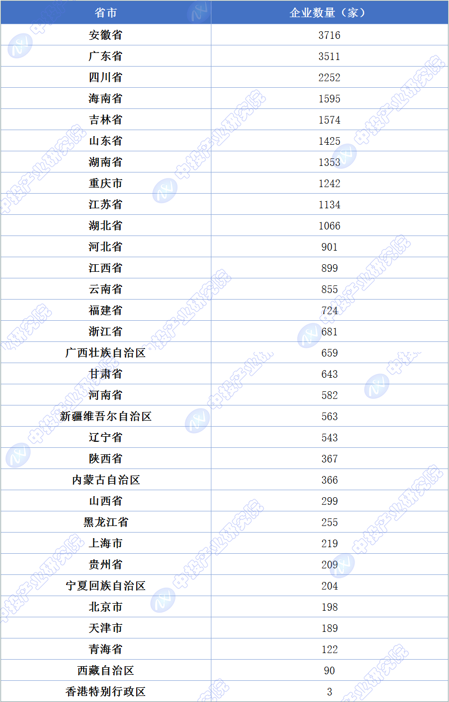 中投产业研究院发布的《2024-2028年中国原料药产业深度调研及投资前景预测报告》显示,截止2024年6月14日,全国经营范围内包含“原料药”的企业28441家,安徽以3716家的数量位居第一,紧跟其后的是广东和四川,分别为3511家、2252家,这三个省中国原料药的重点