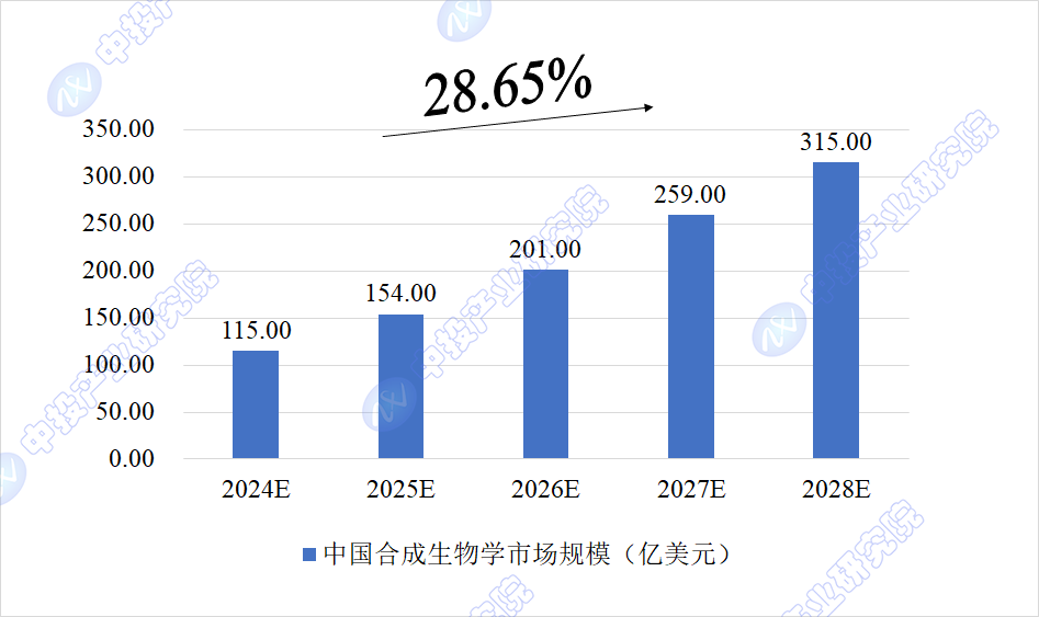 2022年,我国合成生物学行业市场规模约为67.63亿美元;2023年,我国合成生物学行业市场规模约为86.26亿美元。中投产业研究院预计,2024年我国合成生物学行业市场规模将达到115亿美元,未来五年(2024-2028)年均复合增长率约为28.65%,2028年将达到315亿元。