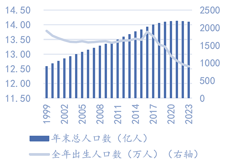 图表:1999-2023年中国年末总人口数和全年出生人口数