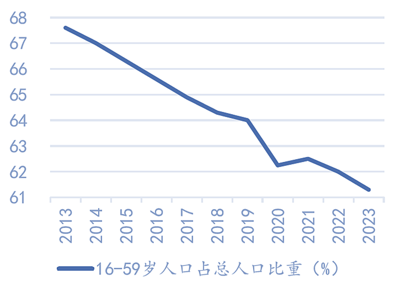 当前我国人口老龄化问题逐步显现,劳动人口数量占比下滑。根据国家统计局数据,2023年末我国人口总数为140,967万人,比上年末减少208万人,2022年我国人口总数也同比减少,实际上我国人口已连续两年呈现负增长。