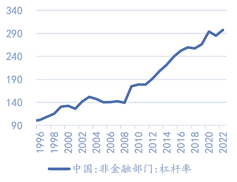 金融部门的总杠杆率从2008年末的139.00%快速上升至2022年的297.40%,杠杆率增长速度较快。横向看,截至2022年末数据,我国非金融部门总杠杆率达到297%,已超越美国(258%)和发达经济体平均水平(267%),仅次于日本(413%),处于全球较高水平。分部门来看,宏观杠杆率总水平的过快上升主要来自于非金融企业部门。2008年12月至2022年末,非金融企业部门对总杠杆率上升的贡献率超过40%。