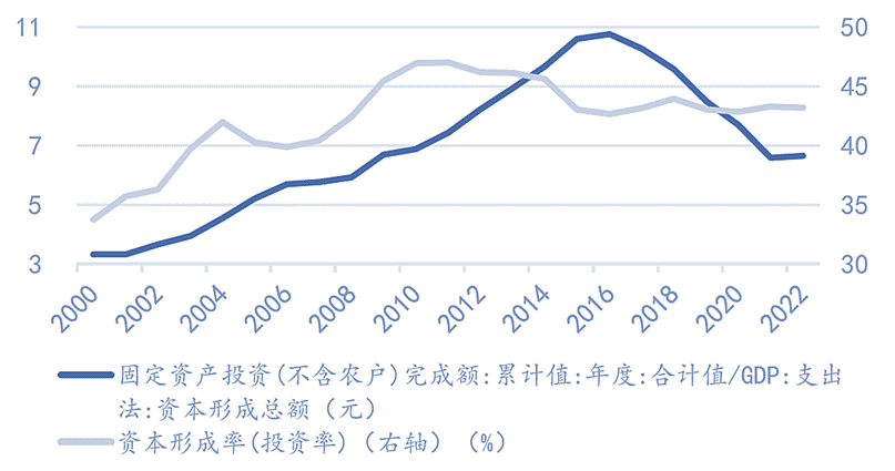 同时,固定资产投资对资本形成转化率下降,每一单位资本形成额对应需要的固定资产投资额从2000年的3.32元提高到2022年的6.65元,资本驱动明显减弱。改变过往依赖大额资本投入拉动增长的模式具有现实意义。