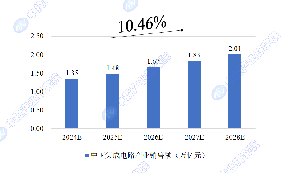 2022年,中国集成电路产业销售额约达到1,2006.1亿元;2023年,中国集成电路产业销售额为12276.9亿元。中投产业研究院预计,2024年我国集成电路产业销售额将达到1.35万亿元,未来五年(2024-2028)年均复合增长率约为10.46%,2028年将达到2.01万亿元。