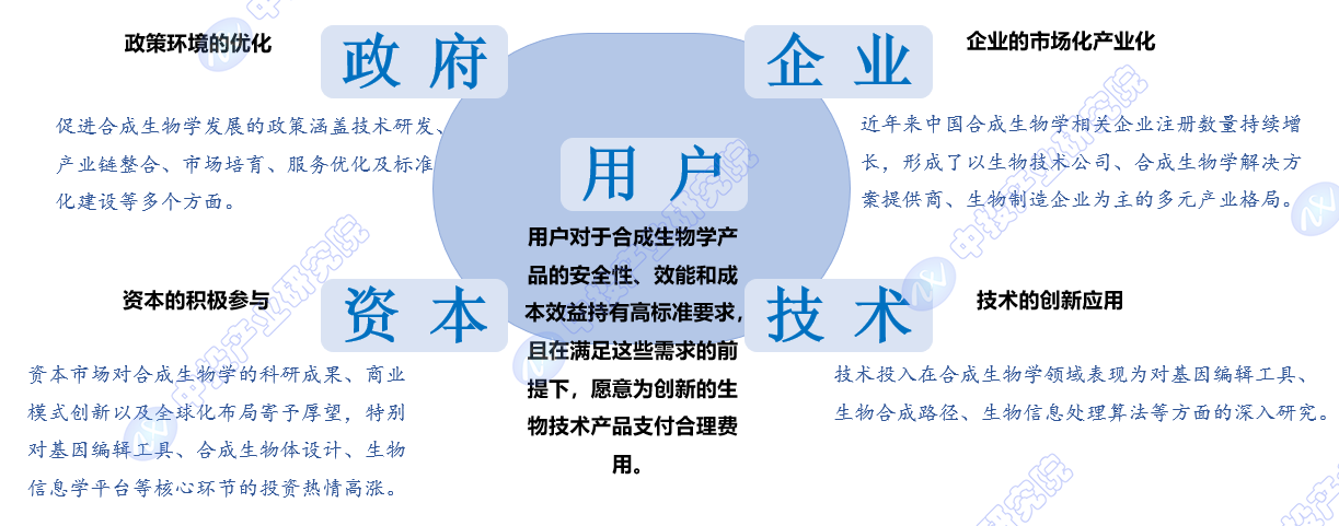 政府支持合成生物学企业进行技术创新,特别是在基因组设计与合成、生物催化、微生物组学等领域,加速科技成果向生产力的转化,推动合成生物学产品的市场应用。