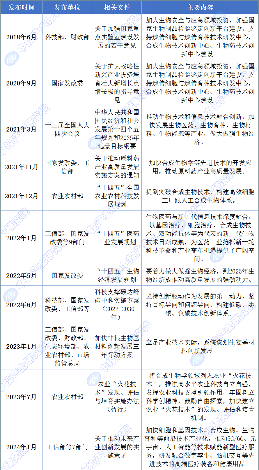 从我国国民经济“八五”计划至“十四五”规划,国家对合成生物学领域的引导和发展主要经历了生物行业顶层设计、细分发展领域引导,以及全面促进下游行业应用的三大阶段。2024年1月,工信部等7部门发布《关于推动未来产业创新发展的实施意见》,提出加快细胞和基因技术、合成生物、生物育种等前沿技术产业化。