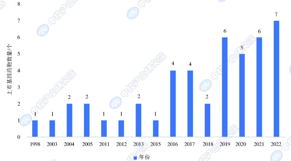 图表:1998-2022年全球基因治疗上市药物数量年度分布