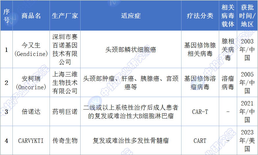 虽然中国在基因治疗领域的起步相对较晚,但其发展速度迅猛,已经成为全球基因药物研发的重要市场之一。在临床试验的数量上,中国仅次于美国,位居世界第二。截至2022年底,中国已有四款国产基因治疗药物成功上市,它们分别是:重组人p53腺病毒注射液(商品名:今又生)、重组人5型腺病毒注射液(商品名:安柯瑞)、倍诺达、西达基奥仑赛(商品名:CARVYKTI)。
