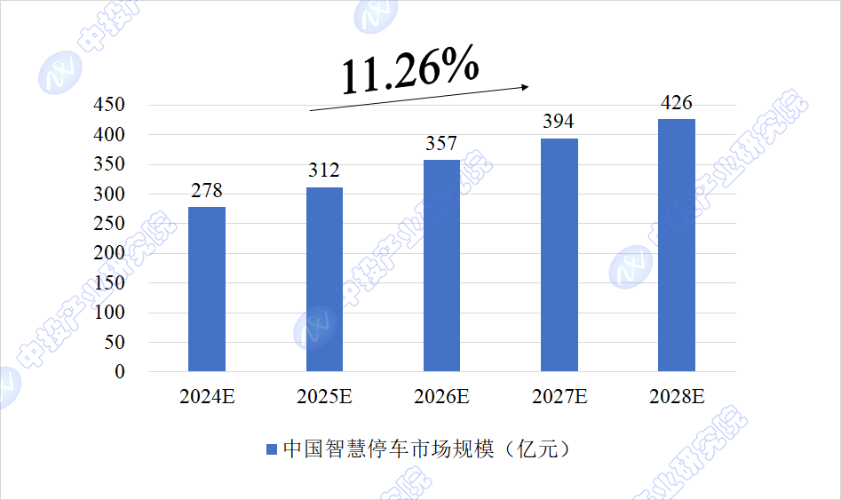 2022年,中国智慧停车市场规模达到217亿元;2023年,中国智慧停车市场规模达到246亿元。中投产业研究院预计,2024年我国智慧停车市场规模将达到278亿元,未来五年(2024-2028)年均复合增长率约为11.26%,2028年将达到426亿元。
