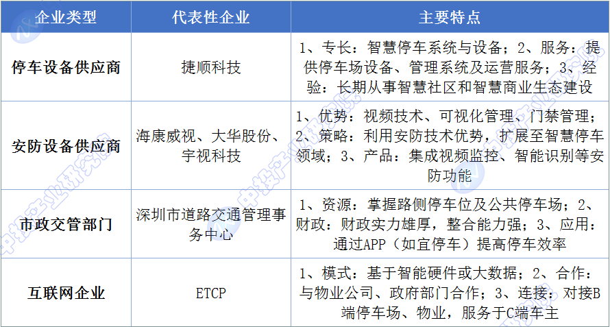 目前,智慧停车行业主要有四类主体参与竞争:其中,停车设备供应商以其专业设备和系统解决方案见长;安防设备供应商则利用其在视频监控和门禁管理方面的技术优势,向智慧停车领域延伸;市政交管部门凭借公共资源和财政支持,推动智慧停车服务的普及和优化;互联网企业则依靠智能技术和大数据分析,搭建连接停车场与车主的高效服务平台。