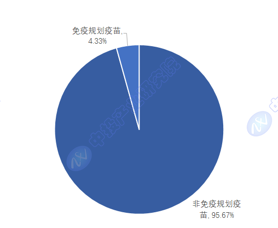 2023年中国疫苗市场(不含新冠疫苗)中,非免疫规划疫苗市场规模为973.6亿元,在疫苗市场占比95.67%;免疫规划疫苗市场规模为44.1亿元,在疫苗市场占比4.33%。