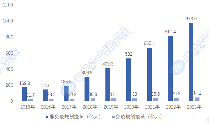 图表:2015-2023年中国疫苗市场(不含新冠疫苗)细分市场规模变化
