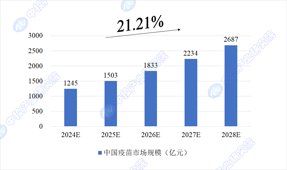 2022年,我国疫苗市场规模达到850.7亿元;2023年,我国疫苗市场规模达到1017.7亿元。中投产业研究院预计,2024年我国疫苗市场规模将达到1,245亿元,未来五年(2024-2028)年均复合增长率约为21.21%,2028年将达到2,687亿元。