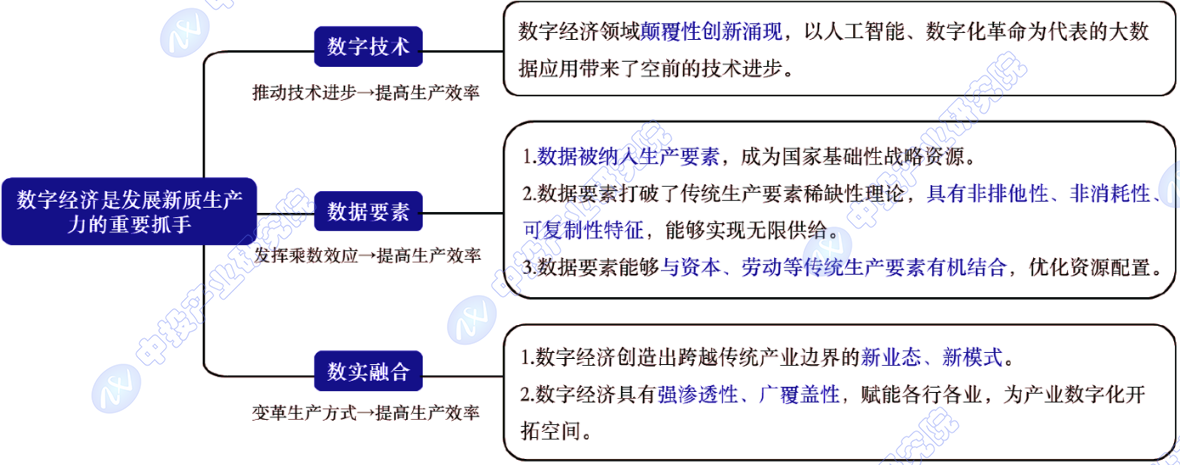 数字经济是新质生产力的重要抓手之一。数字经济是一种以数字化知识和信息为主要生产要素,以数字技术为核心驱动力,以现代信息网络为重要载体,通过数字技术与实体产业的深度融合,不断提升经济和社会的数字化、网络化、智能化程度,加速重塑经济发展模式与治理方式的新型经济形态。数字经济在基础设施建设、生产要素配置、生产与服务模式等方面展现出与传统经济显著不同的特征和规律,它转变了经济发展模式,提升了全要素生产率,成为推动新质生产力成长的重要力量。