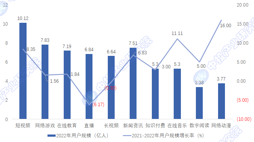 图表:2022年中国数字内容产业细分领域用户规模及增长率