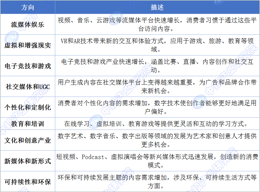 数字内容产业已成为引导价值观、社会舆论和文化发展的重要途径。网络文学、新媒体、视频剪辑、游戏动画等领域通过创新数字技术展现出巨大潜力。未来,流媒体娱乐、虚拟现实、电子竞技、UGC内容、个性化定制、在线教育、文化和创意产业、新兴媒体形式以及环保内容等方向将推动数字内容产业的持续增长。