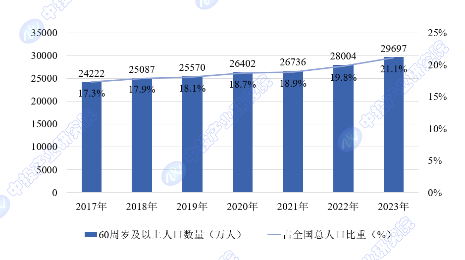 中投产业研究院发布的《2025-2029年中国银发经济投资分析及前景预测报告》指出,我国老年人口规模庞大,截至2023年末,我国60岁及以上人口29697万人,占全国人口的21.1%,其中65岁及以上人口21676万人,占全国人口的15.4%。这意味着我国已全面进入中度老龄化社会,中国银发经济市场规模持续增长。