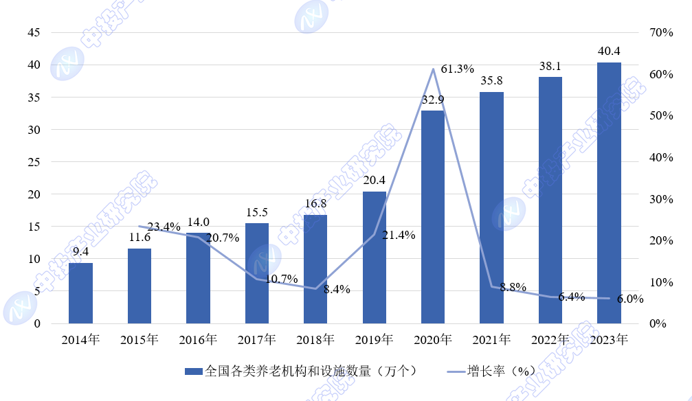 截至2023年末,全国共有各类养老机构和设施40.4万个,养老床位合计823万张。其中,注册登记的养老机构4.1万个,床位517.2万张(护理型床位占比为58.9%);社区养老服务机构和设施36.3万个,床位305.8万张。
