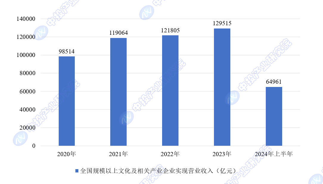 图表:2020-2024年全国规模以上文化及相关产业企业营业收入